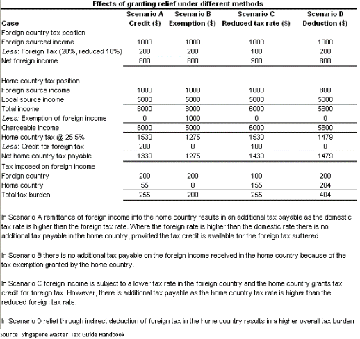 在这种情况下,国内税收适用于扣除国外税收后的外国收入。新加坡不允许扣除外国所得税。然而,根据汇款基础,新加坡将对在新加坡收到的外国收入(即外国税收净额)进行间接扣除。