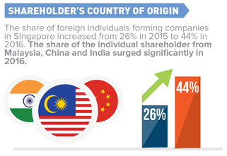 子公司形成由外国公司在第四季度的总分公司结构仍然占47%。从英属维尔京群岛(6%)和香港(5%)的实体继续占形成外国子公司的份额最高。新加坡继续吸引国际投资者和企业家。外国自然人股东组成的公司的份额从44%在第三季度在第四季度上升至45%。来自印度,中国和马来西亚的个人继续占主导地位。个人投资者也越来越多来自不同的国家,如日本,菲律宾和韩国的未来。